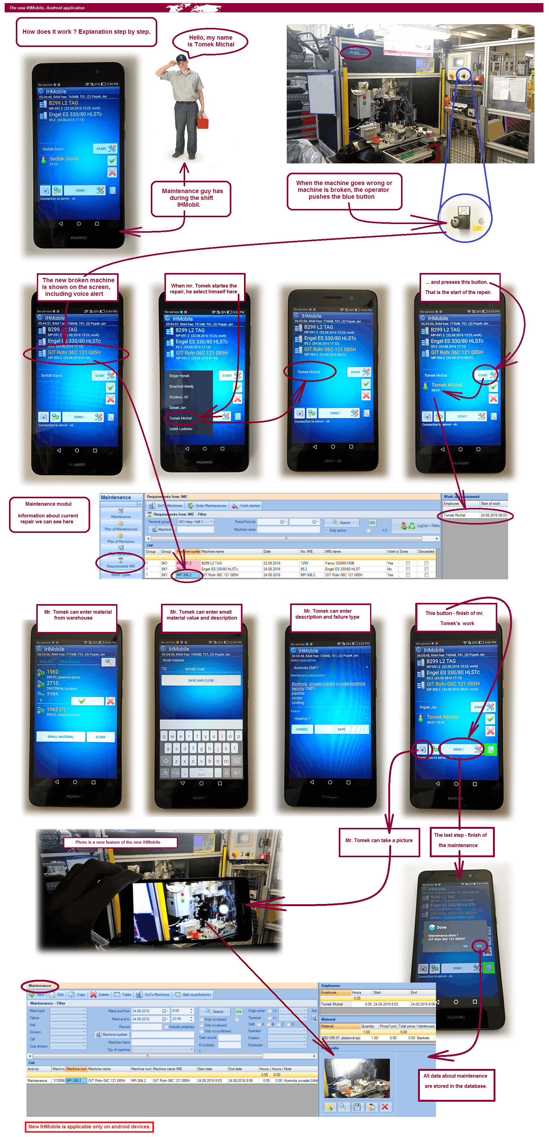 IHMobile is an Android application for maintenance technicians. Failures are reported from the shopfloor, technicians receive notifications, and the entire repair is logged in IMES in real time.